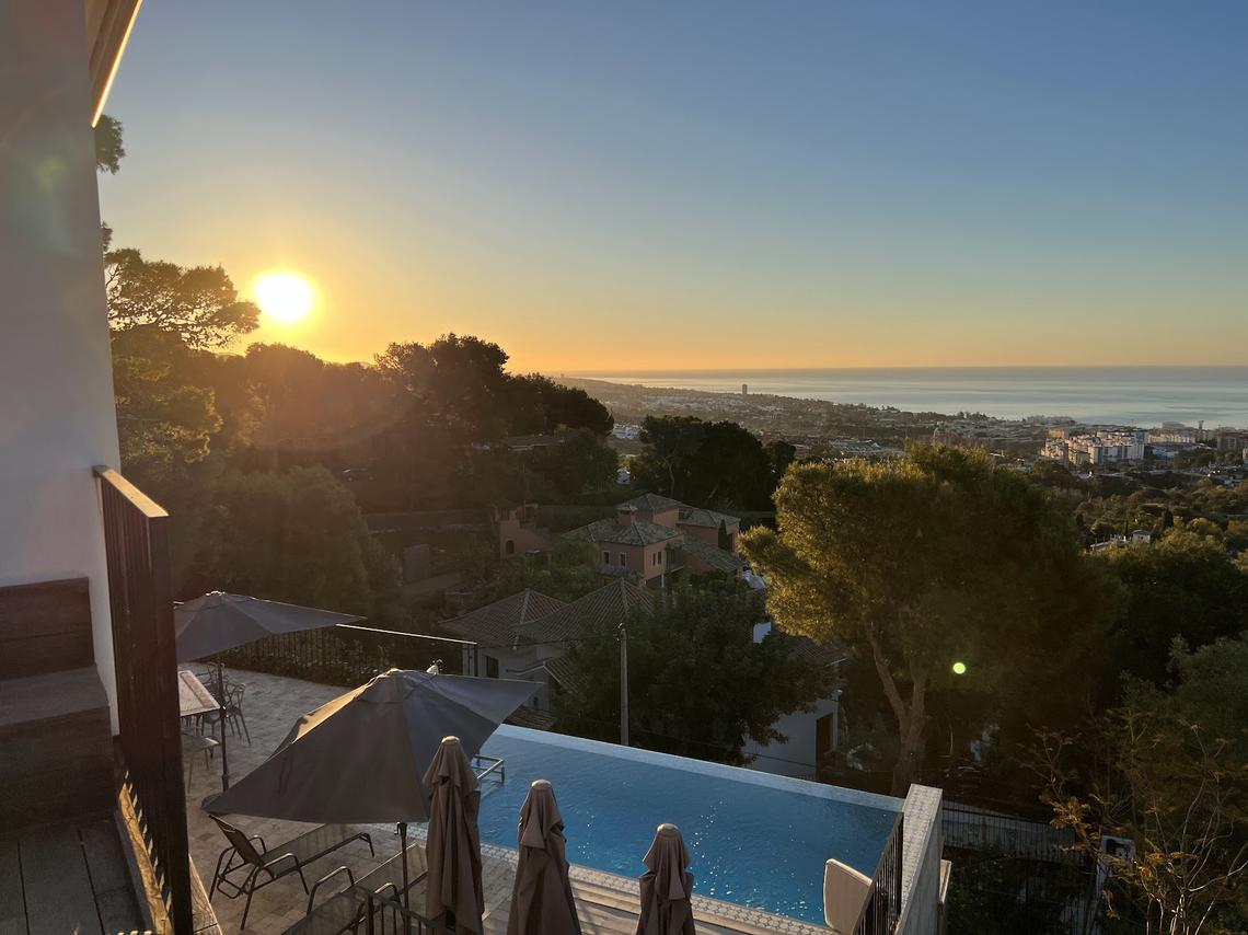 Spektakulär utsikt över hela Marbella, Medelhavet bort till Gibraltar och Afrika. Svenskägd. Sex sovrum, fem badrum, två fullutrustade kök. Färdigställd 2021. Pool, jacuzzi, medelshavsträdgård med flera uteplatser. Högklassig mix av skandinavisk och andalusisk design med en touch av Marrakech. 10 minuter till centrum av Marbella, 15 minuter till Porto Banus. Mitt på Solkusten med minst 70 golfbanor av världsklass. 325 soldagar om året.